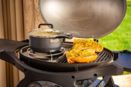 Міцна кришка та корпус з литого алюмінію мають високу куполоподібну конструкцію, що дозволяє готувати на грилі великі продукти, такі як ціла курка або індичка. Крім того, потужне нагрівання, що забезпечується вдосконаленою системою запалювання, дозволяє вибирати, чи готувати з відкритою або закритою кришкою.